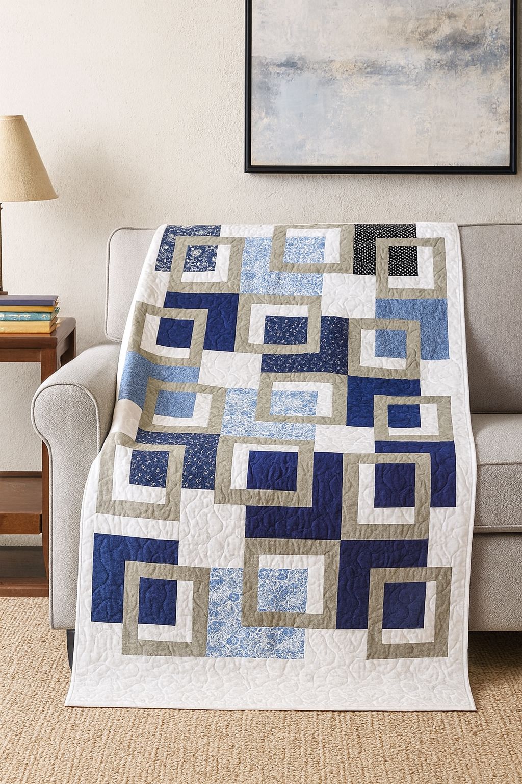 A fresh, modern quilt pattern featuring a beautiful floating-window effect. Beginner-friendly, illustrated, and instantly downloadable — the Skyline Squares Quilt Pattern looks stunning in any color palette.